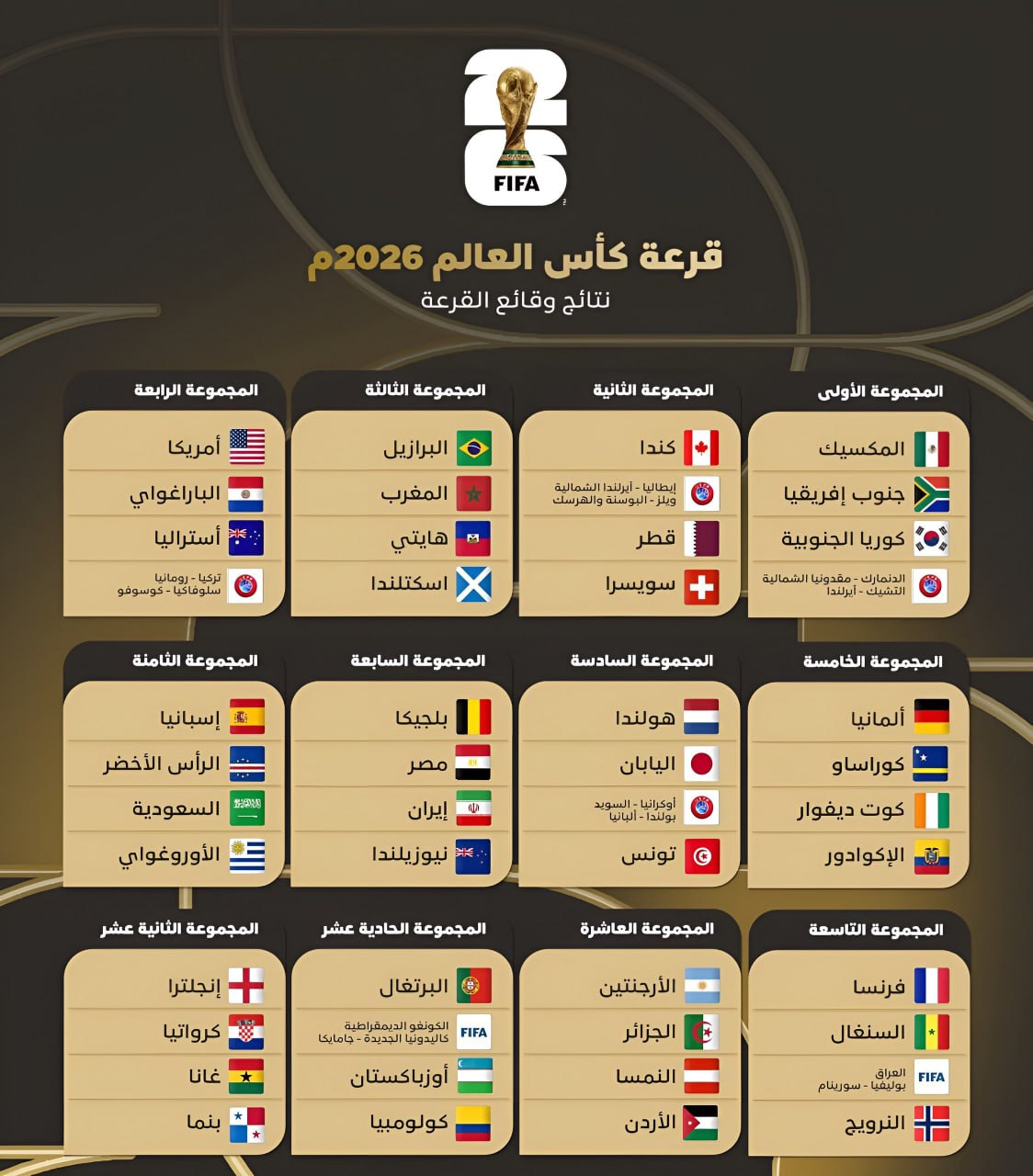ووقعت المنتخبات العربية في مواجهات صعبة، حيث سيلعب المنتخب المغربي في مجموعة تضم البرازيل واسكتلندا، فيما يصطدم المنتخب الجزائري بالأرجنتيني في أول مبارياته.