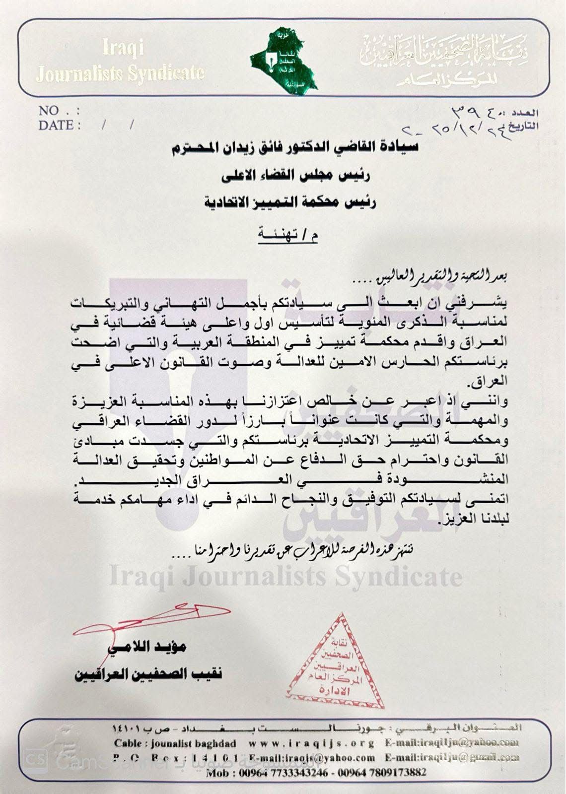 وجّه نقيب الصحفيين العراقيين مؤيد اللامي برقية تهنئة إلى رئيس مجلس القضاء الأعلى ورئيس محكمة التمييز الاتحادية، القاضي الدكتور فائق زيدان، بمناسبة حلول الذكرى المئوية لتأسيس محكمة التمييز الاتحادية، أعرق وأعلى هيئة قضائية في العراق.